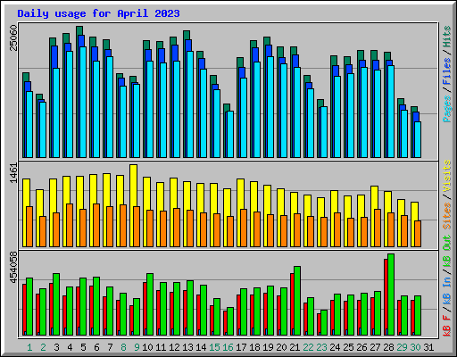 | Day | Hits | Files | Pages | Visits | Sites | kB F | kB In | kB Out | ||||||||