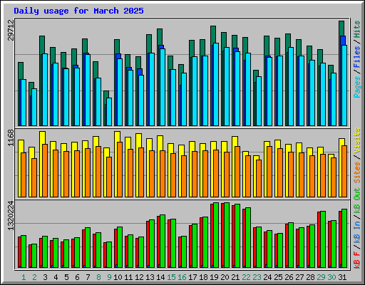 | Day | Hits | Files | Pages | Visits | Sites | kB F | kB In | kB Out | ||||||||